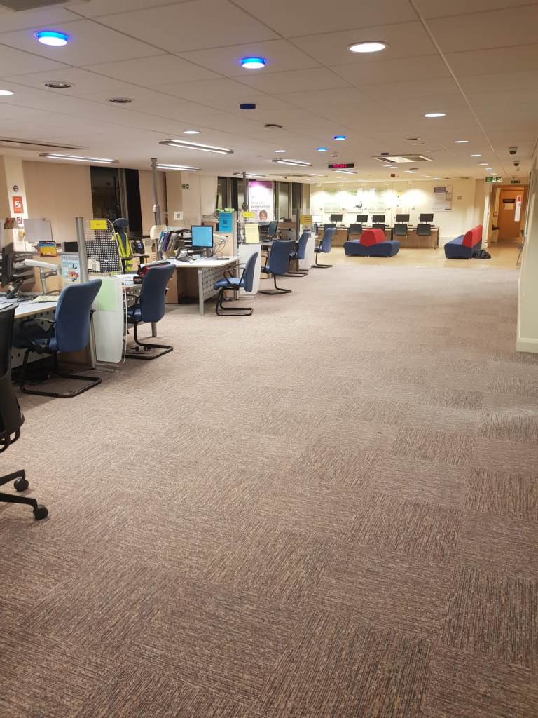 Client: Department for Work & Pensions in Ashford Brief: To supply & install 700m2 of Milliken Carpet Tiles flooring to