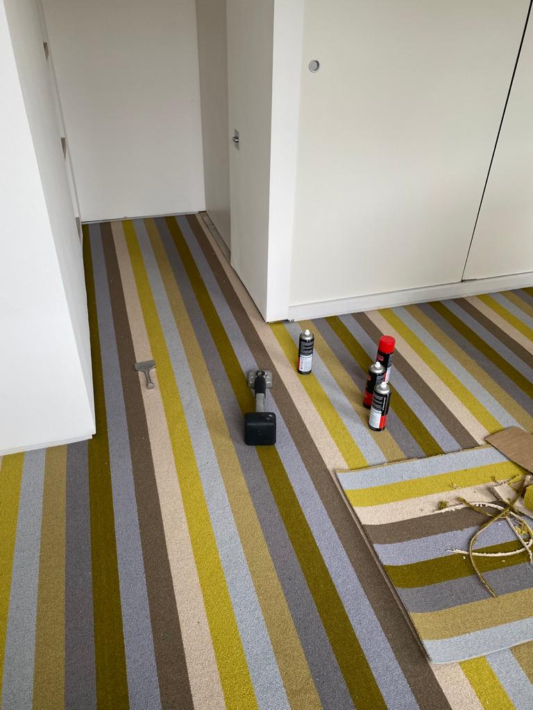 Client: Private Residence In Hammersmith Brief: To supply & install Alternative Flooring Wool Blocstripe Bone Olive Bloc carpet to premises