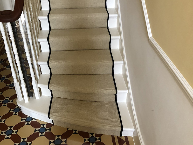 Client: Private Residence In Hampstead Brief: To supply & install sisal carpet with black edging to stairs [one_half][/one_half] [one_half_last][/one_half_last]