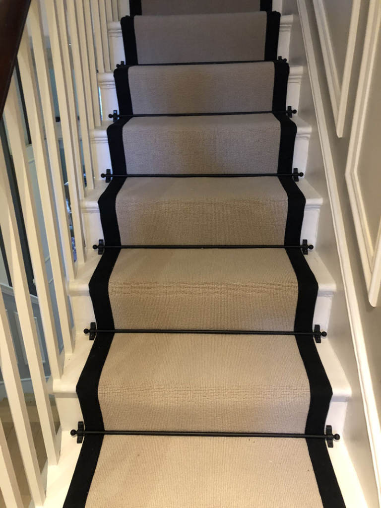 Client: Private Residence In Fitzrovia Brief: To supply & install carpet with black border as a runner to stairs [one_half][/one_half]