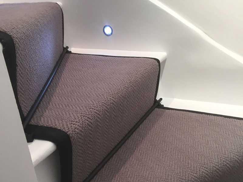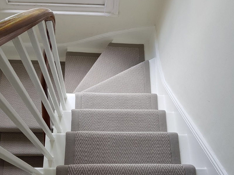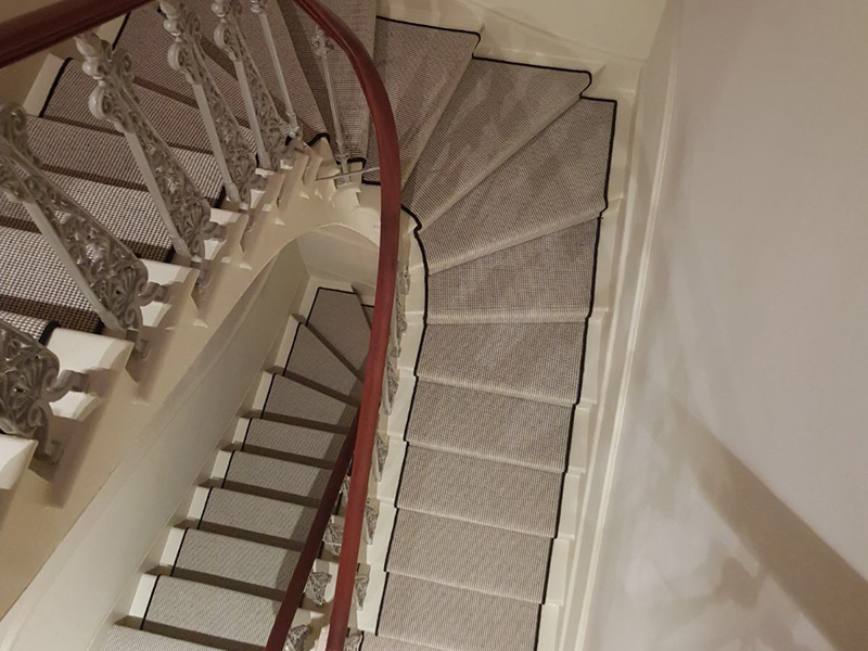 Client: Private Residence In East London Brief: To supply & install grey wool carpet with black binding to stairs
