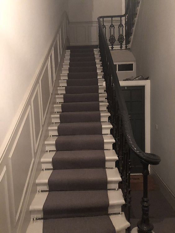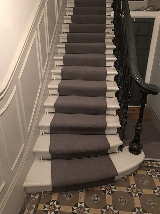Grey Carpet With Rods Installed In PimlicoBy djon / November 19, 2018 Client: Private Residence In Pimlico Brief: To supply & install grey carpet to stairs with stair rods